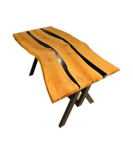 Siyah Metal Renault Ayaklı Epoksi Uygulamalı Ceviz Doğal Ahşap Yemek Masası